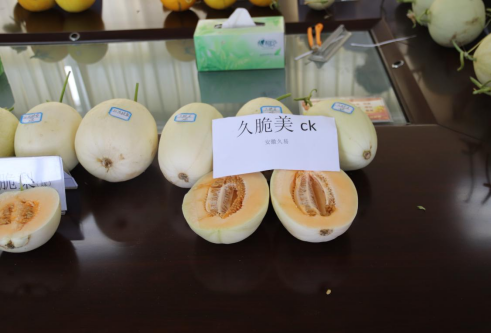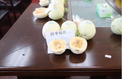 1、厚皮甜瓜 白皮红肉长椭圆脆肉类厚皮甜瓜久脆美、四季银红2号,单果重1.5-2㎏,成熟期40-45天,中心糖度15度左右,较耐重茬,适宜地爬式、立架式栽培。
