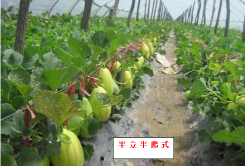 ③半立半爬式 厚皮甜瓜适用,兼具地爬式立架式优点,产品商品性好,用工投入也不多。