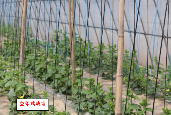 ②立架式 厚皮、薄皮甜瓜都适宜用,高密度栽培,产品商品性好,商品瓜比地爬式要小,适宜于园区观光采摘;但投工较多。