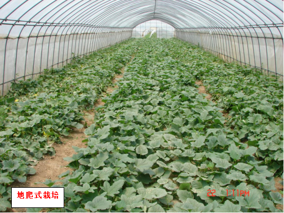 ①地爬式 厚皮、薄皮甜瓜都适宜用,一般栽培密度,产品商品性略差,用工投入少。