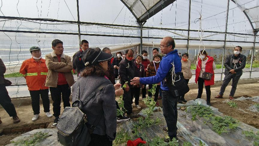 种植大棚内,农艺师边讲解如何整枝、牵藤,边做示范,学员围在旁边听得津津有味。