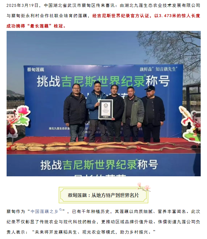 蔡甸莲藕以3.473米刷新吉尼斯世界纪录!